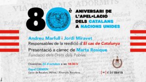 El divendres 24 d’octubre a les 18:30 h commemorem el 80è aniversari de l’apel·lació dels catalans a Nacions Unides amb un acte a l’Espai CIEMEN junt amb el Memorial 1714. Els responsables de la reedició, Andreu Marfull i Jordi Miravet, ens parlaran del Cas de Catalunya. Marta Rosique de la Fundació dels Drets dels Pobles presentarà l’acte.